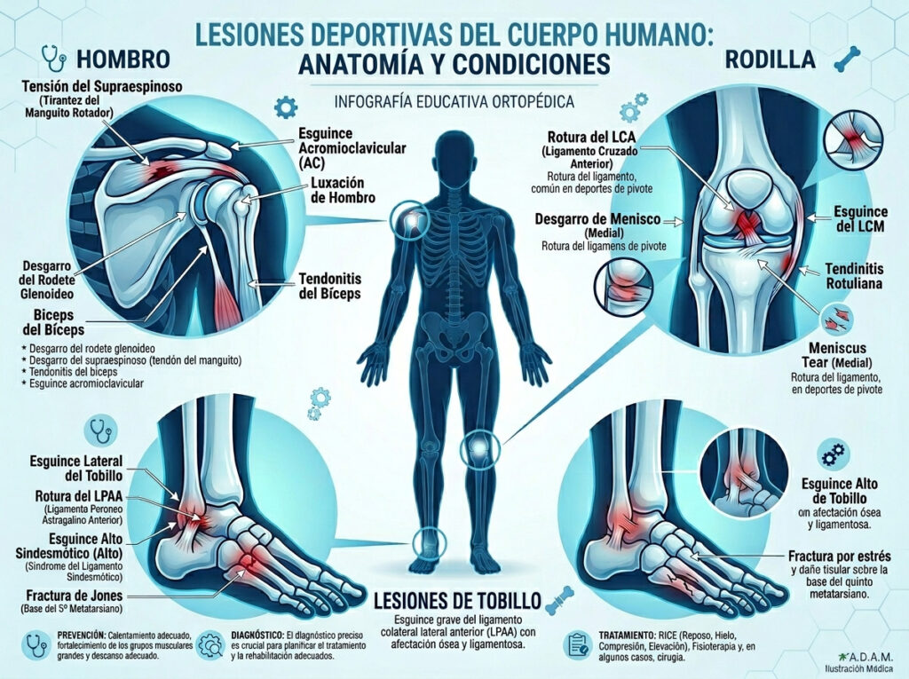 Las lesiones deportivas son daños al sistema músculo-esquelético — músculos, tendones, ligamentos, cartílagos y huesos — que ocurren durante la práctica deportiva. Pueden presentarse por un trauma agudo único o por la acumulación de microdaños por sobreuso crónico.